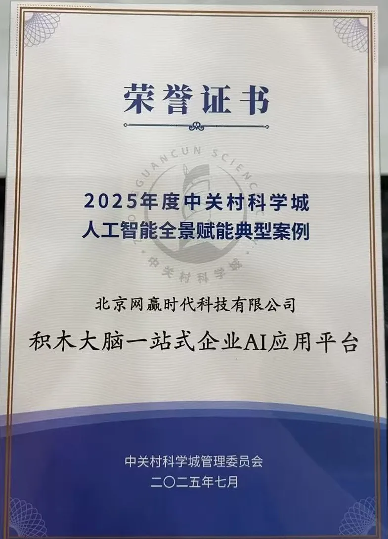 7月 29 日,中关村论坛系列活动 —— 中关村人工智能与未来城市论坛在中关村国家自主创新示范区展示中心隆重举办。作为论坛重要成果,2025 年度中关村科学城人工智能全景赋能典型案例正式发布,北京网赢时代科技有限公司自主研发的 "积木大脑 —— 一站式企业 AI应用平台"凭借在企业服务领域的突出表现成功入选。此次评选以 "AI + 城市:数启新纪元" 为主题,彰显了人工智能技术与城市发展深度融合的前沿趋势,网易、百川、零一万物、中科院等单位也都参加并获此奖项。